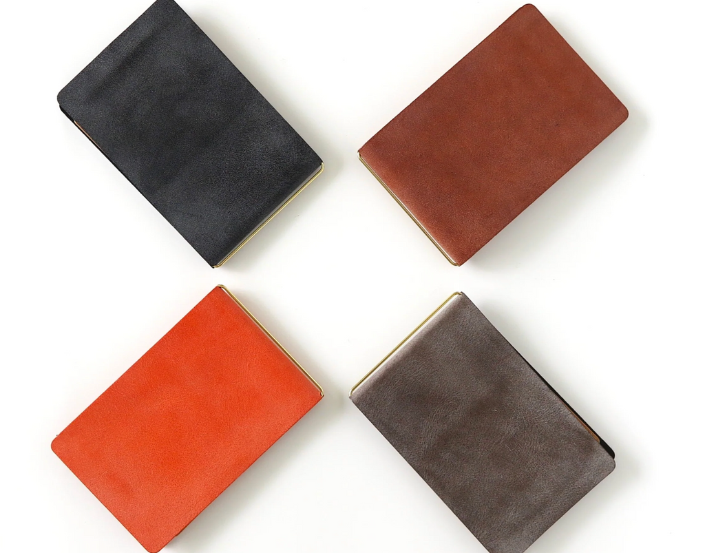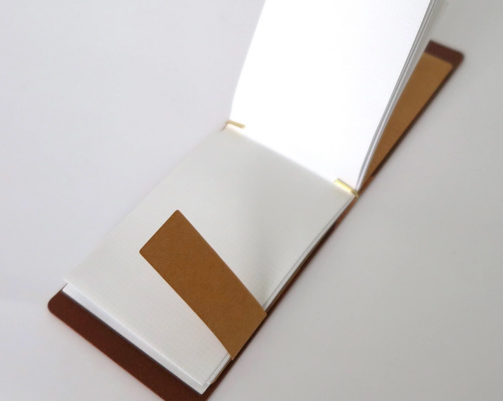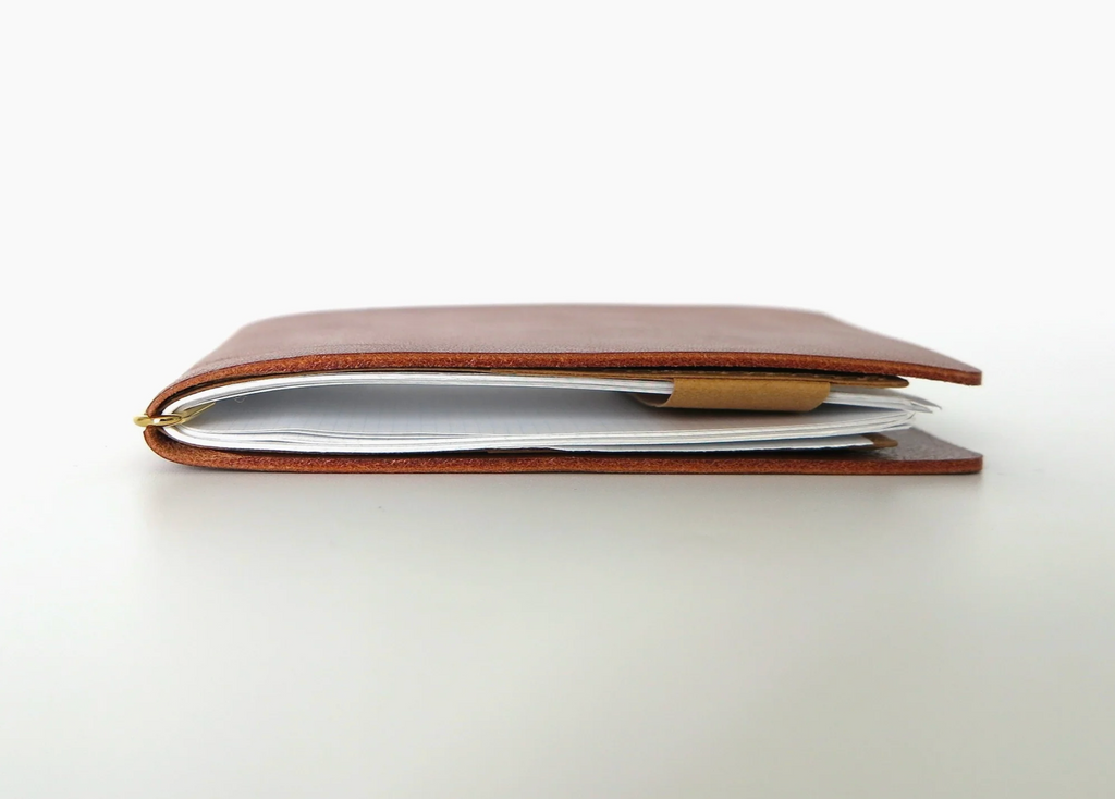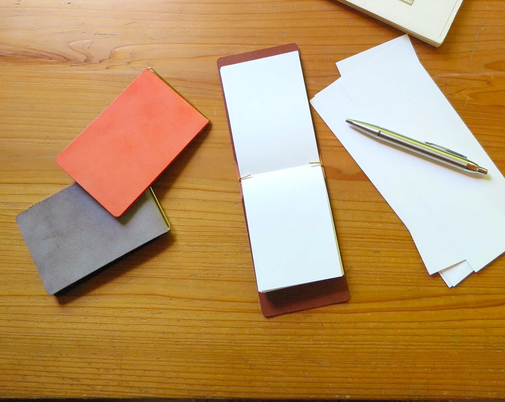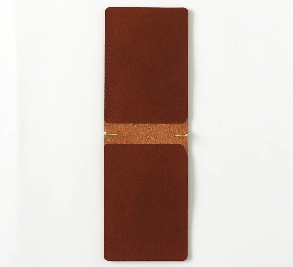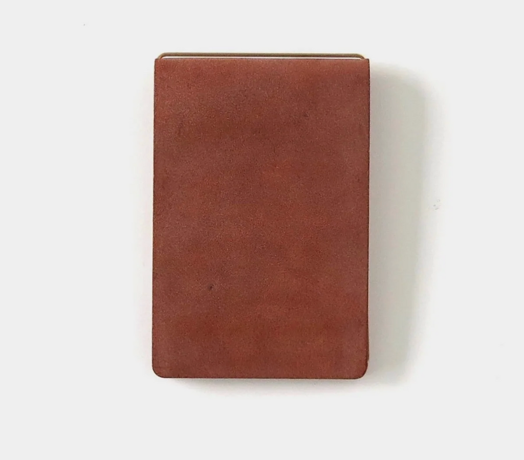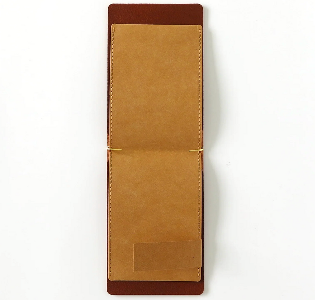 This palm-sized memo pad can be used as a refill by clipping 15-20 sheets of A4 paper, cut into quarters, onto the brass hook attached to the cover. It also has an inner pocket for storing cards and other items. It can also be used as a money clip.